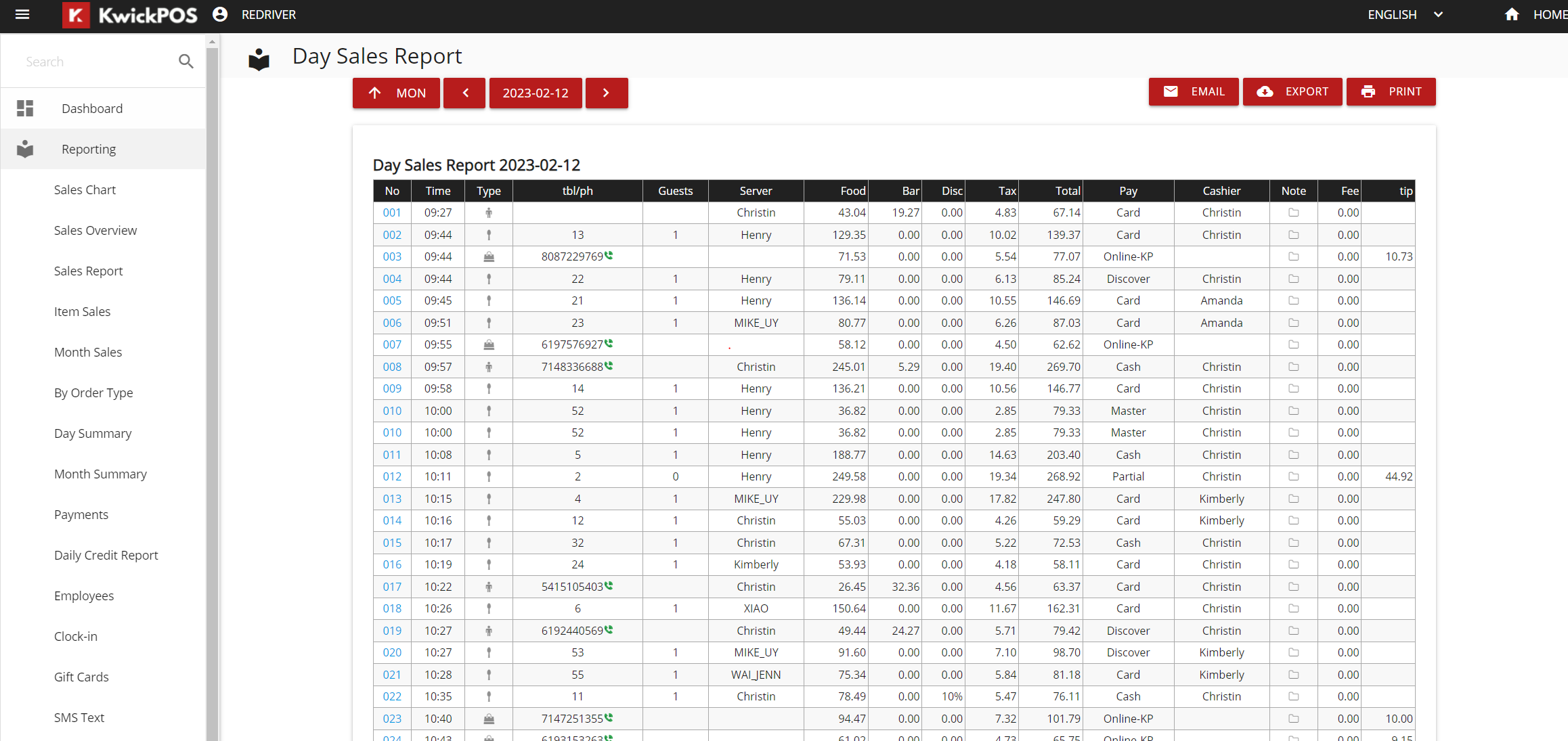 The Day Sales Report will show you the detailed report of the day. The Sales Report can be emailed, exported, and printed.