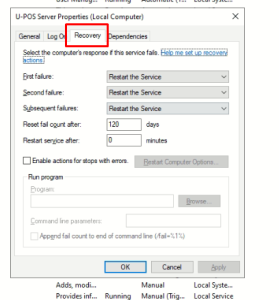 6. Go to Services the find UPOS Server. Just click properties and go to the recovery tab and follow these settings