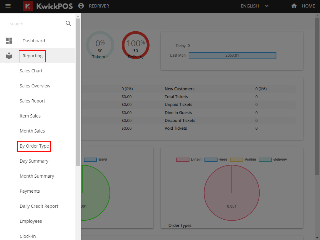 - Click on Tools button, Back Office button, Reporting button, then By Order Types.