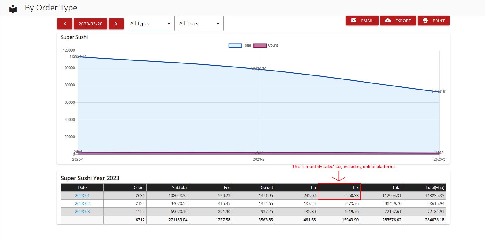 - Subtract Doordash taxes from total sales taxes (Total tax can be found in All Types).