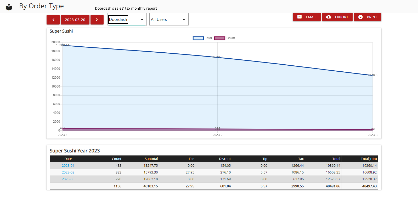 - Selecting one of the three online platforms, for example, DoorDash. This displays the sales tax only for DoorDash.