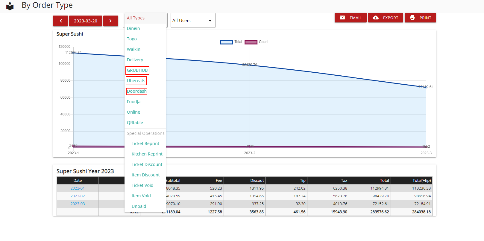 - Above the “All Types” column, click on it, and select Doordash, Uber Eats, or GrubHub
